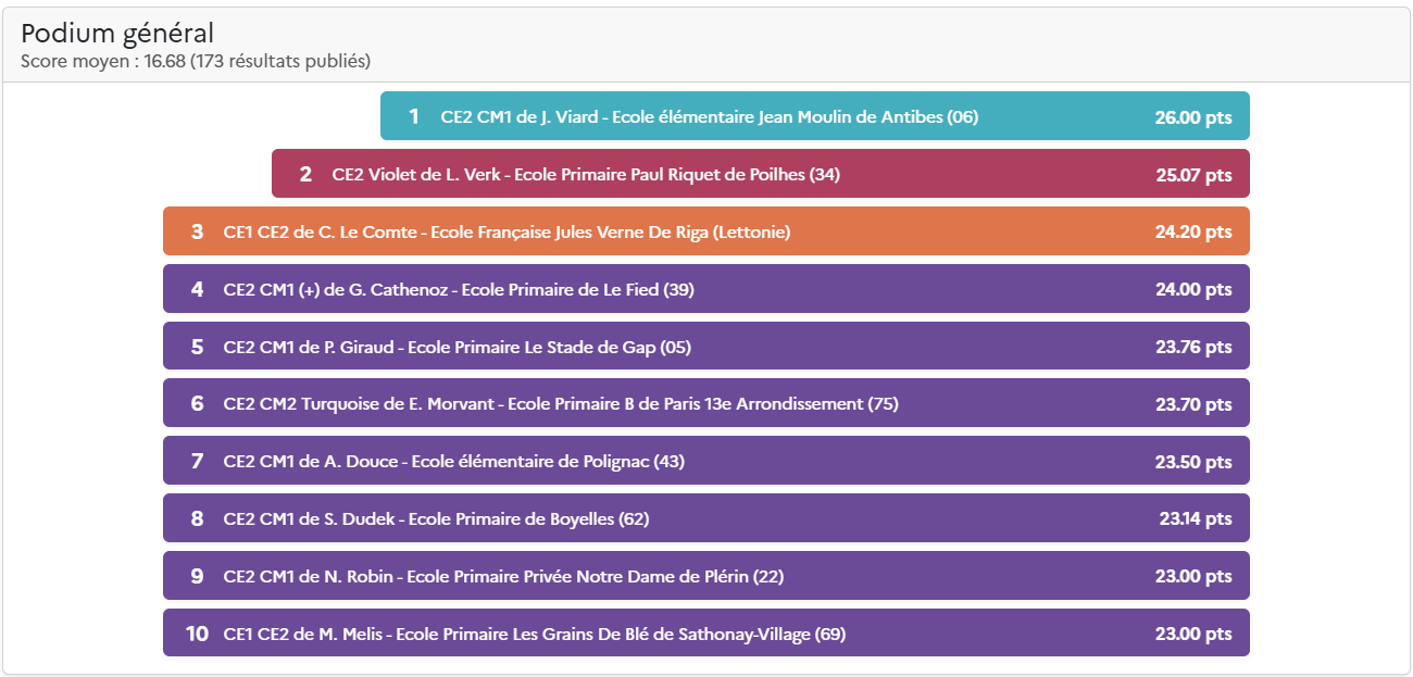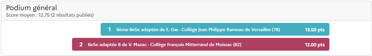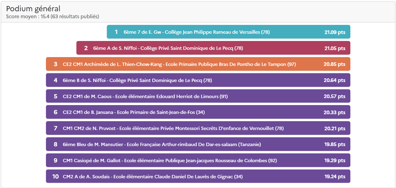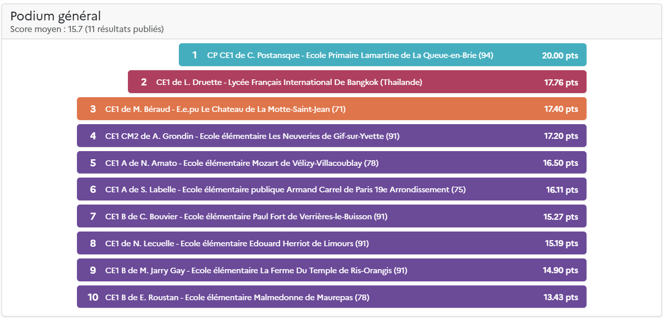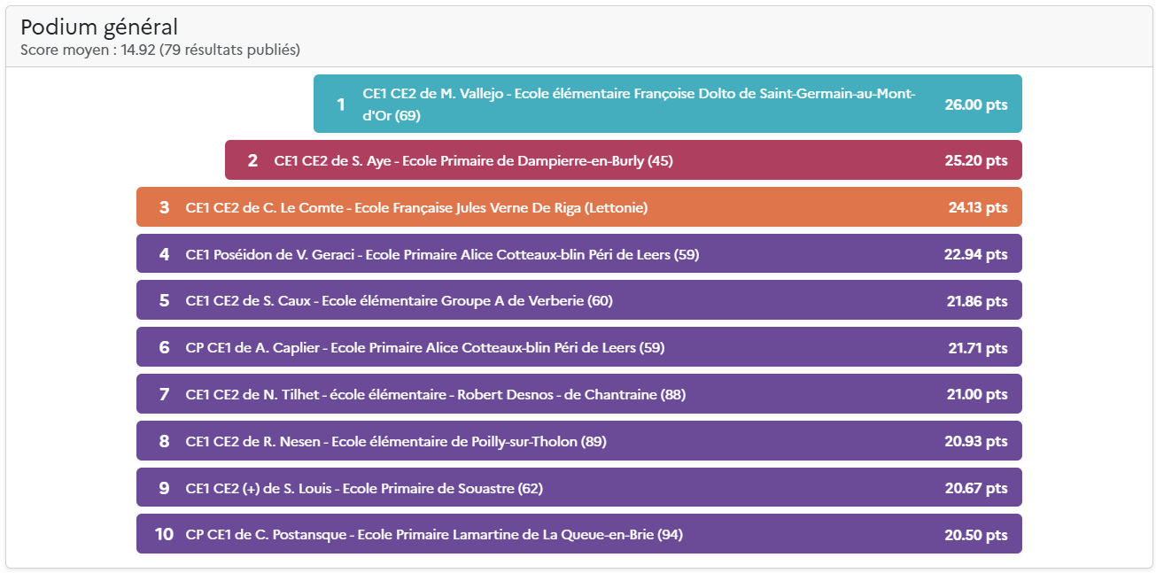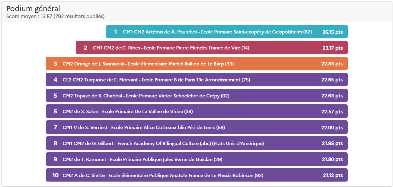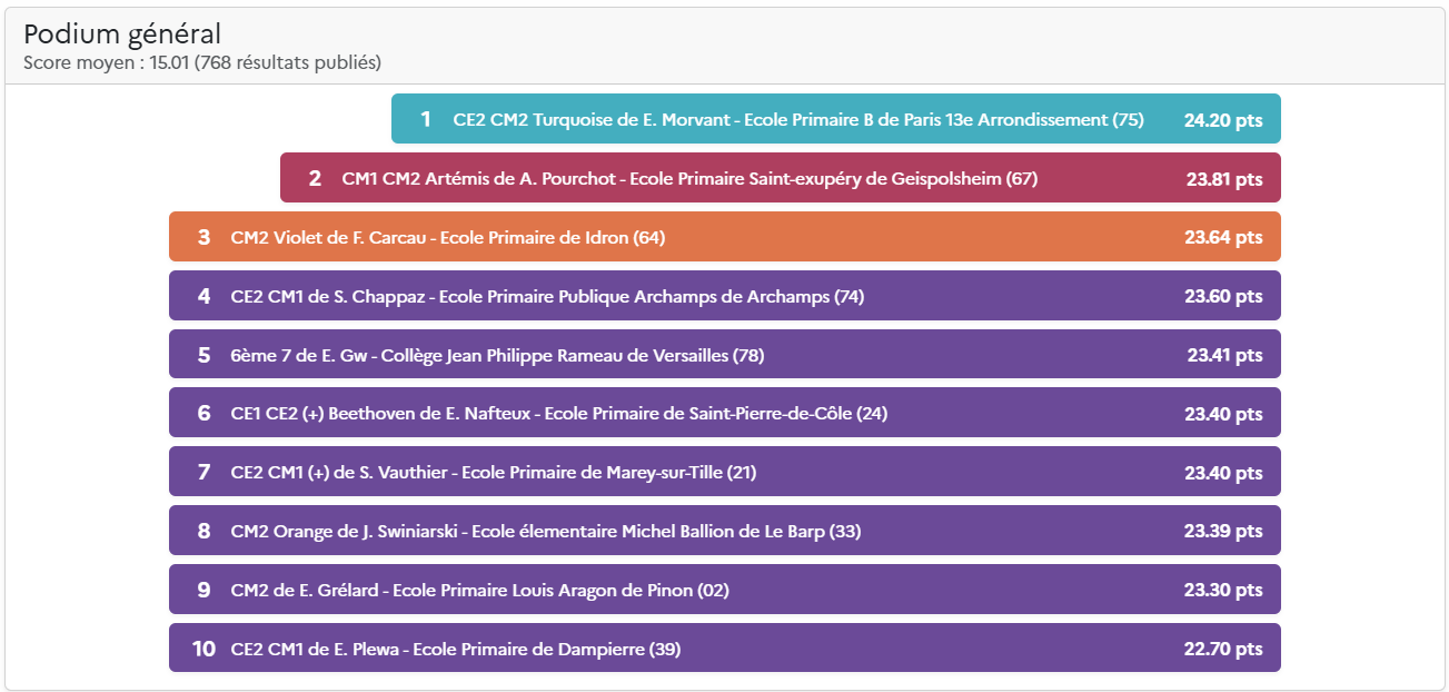 Le score total comprend la moyenne de la classe (moyenne des scores des élèves) et les points des défis de classe hebdomadaires. Pour plus d’information, découvrez les nouvelles règles du Concours.