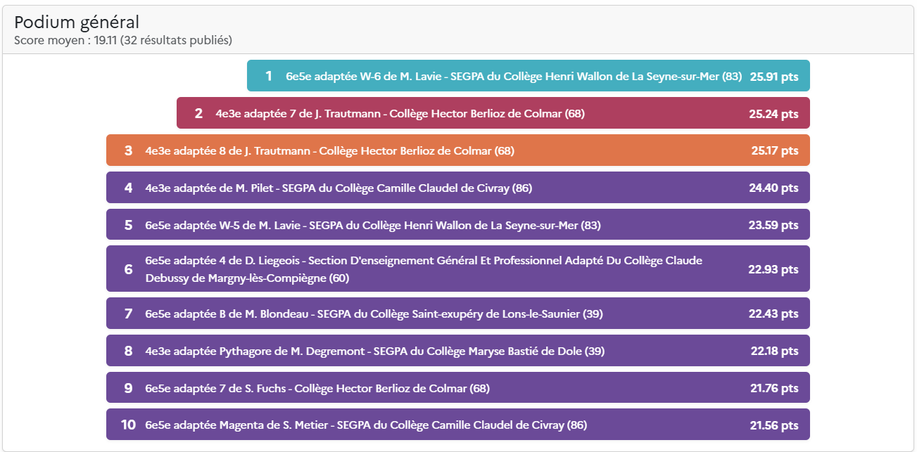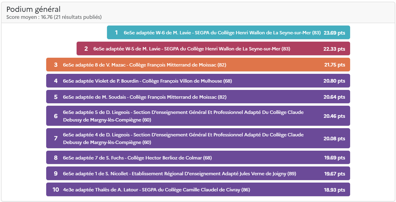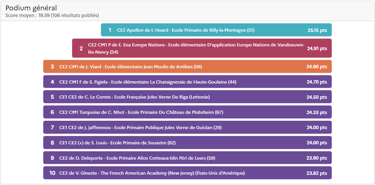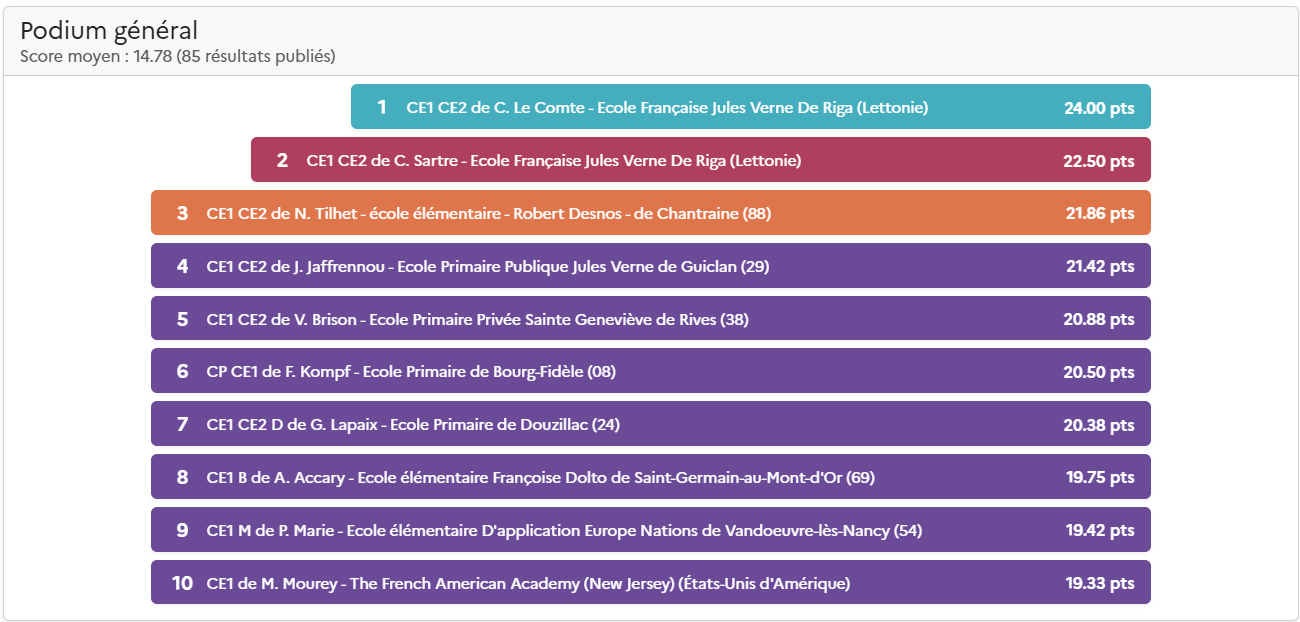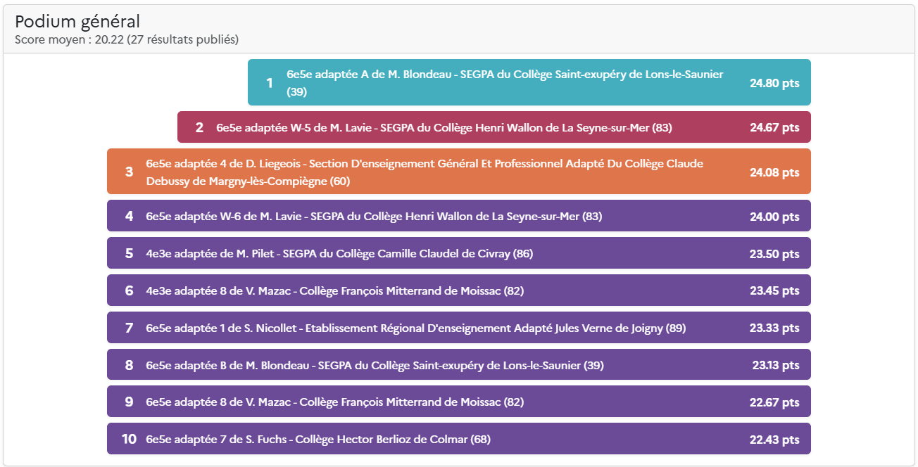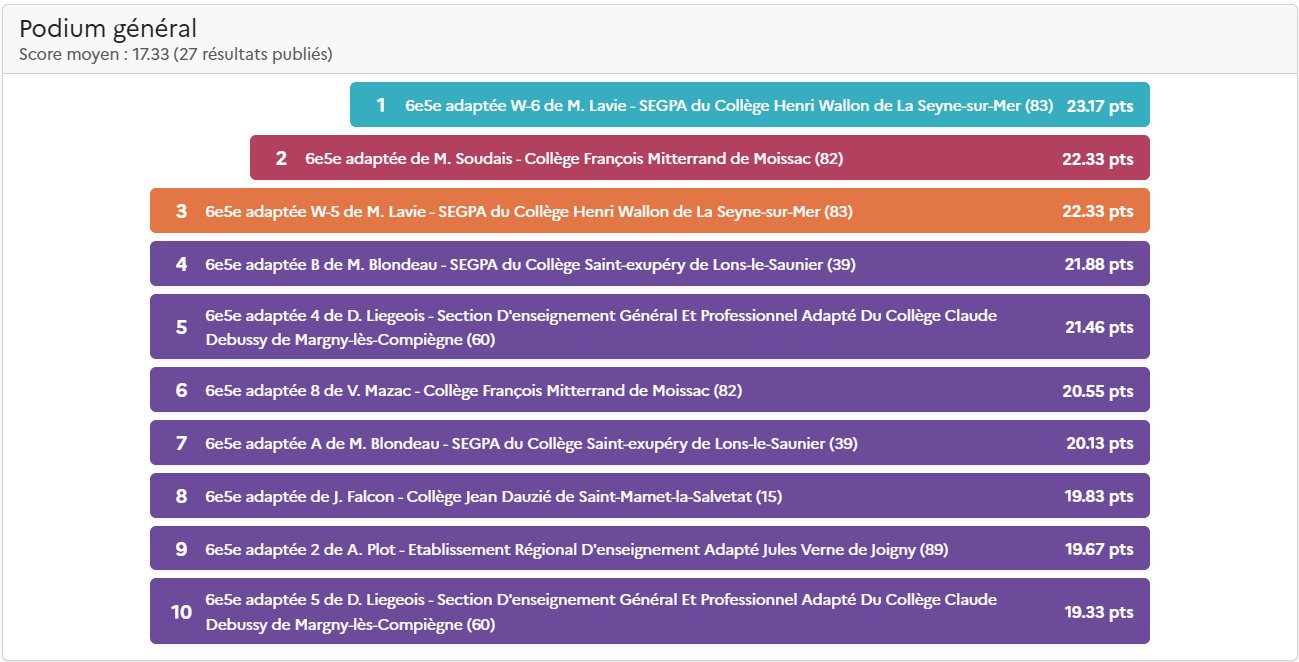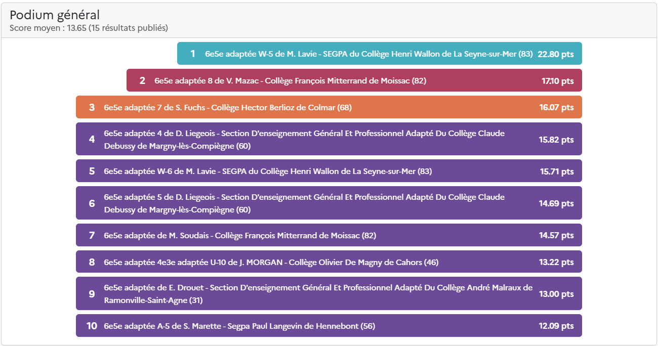 Le score total comprend la moyenne de la classe (moyenne des scores des élèves) et les points des défis de classe hebdomadaires. Pour plus d’information, découvrez les nouvelles règles du Concours.